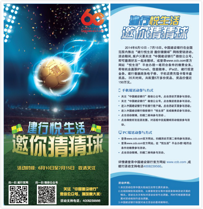 全球球迷盛典,建行重磅活动,猜球赢大奖!iphone5,佳能微单、ipad、建行金条、善融券、话费卡各式大礼送不完,快打开你的悦生活准备吧! 活动时间:6.10-7.15,敬请关注