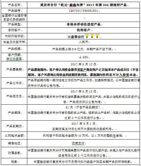 1.本期产品规模上限:0.9亿元。在本期产品募集期内,对本期产品的认购金额达到本期理财产品规模上限,则中国建设银行重庆市分行有权利但无义务停止本期产品的认购,已经认购成功的客户投资权益不受影响。