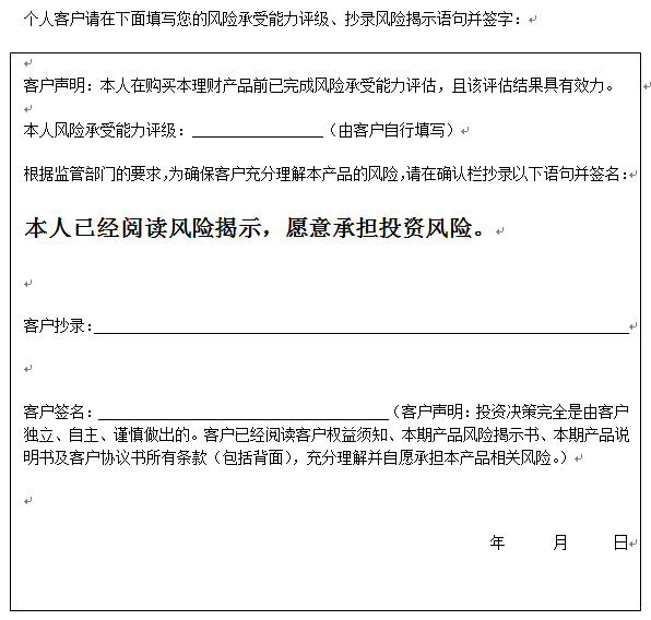 在您签署《中国建设银行股份有限公司理财产品客户协议书》前,应当仔细阅读客户权益须知、本风险揭示书及本产品的产品说明书的全部内容,同时向中国建设银行了解本产品的其他相关信息,并自己独立做出是否认(申)购本产品的决定。