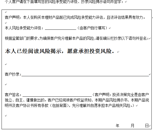 在您签署《中国建设银行股份有限公司理财产品客户协议书》前,应当仔细阅读客户权益须知、本风险揭示书及本产品的产品说明书的全部内容,同时向中国建设银行重庆市分行了解本产品的其他相关信息,并自己独立做出是否认(申)购本产品的决定。