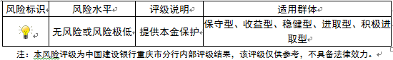 本期产品为保本浮动收益型理财产品,本理财产品有投资风险,只保障理财资金本金,不保证理财收益,您应当充分认识投资风险,谨慎投资。本期产品期限为50天(中国建设银行重庆市分行有权对产品进行展期或提前终止)。本期产品内部风险评级级别为一盏警示灯,风险程度属于无风险或风险极低,适用于保守型、收益型、稳健型、进取型及积极进取型投资者。最不利情况下,客户只能收回投资本金,不能获得任何投资收益。