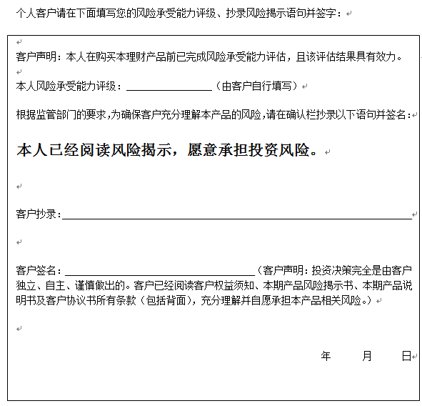 在您签署《中国建设银行股份有限公司理财产品客户协议书》前,应当仔细阅读客户权益须知、本风险揭示书及本产品的产品说明书的全部内容,同时向中国建设银行重庆市分行了解本产品的其他相关信息,并自己独立做出是否认(申)购本产品的决定。