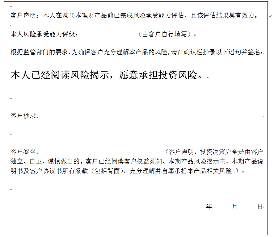 个人客户请在下面填写您的风险承受能力评级、抄录风险揭示语句并签字:
