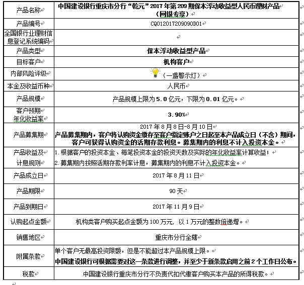 1.本产品规模上限:5.0亿元。在本期产品募集期内,对本期产品的认购金额达到本期理财产品规模上限,则中国建设银行重庆市分行有权利但无义务停止本期产品的认购,已经认购成功的客户投资权益不受影响。