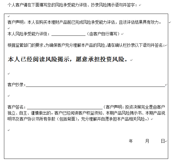 在您签署《中国建设银行股份有限公司理财产品客户协议书》前,应当仔细阅读客户权益须知、本风险揭示书及本产品的产品说明书的全部内容,同时向中国建设银行了解本产品的其他相关信息,并自己独立做出是否认(申)购本产品的决定。