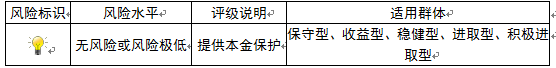 ,风险程度属于无风险或风险极低,适用于保守型、收益型、稳健型、进取型及积极进取型投资者。最不利情况下,客户只能收回投资本金,不能获得任何投资收益。