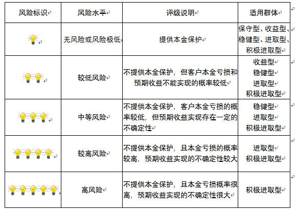 ,风险水平属于较低风险。最不利情况下,您将损失全部收益甚至包括全部本金。本理财产品适用于收益型、稳健型、进取型 、积极进取型客户。