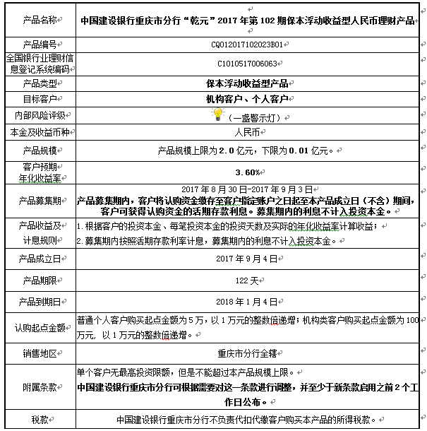 1.本产品规模上限:2.0亿元。在本期产品募集期内,对本期产品的认购金额达到本期理财产品规模上限,则中国建设银行重庆市分行有权利但无义务停止本期产品的认购,已经认购成功的客户投资权益不受影响。