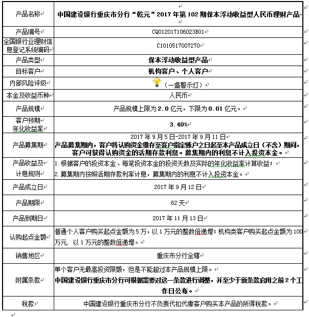 2.本产品规模下限:0.01亿元。在本期产品募集期内,对本期产品的认购金额未能达到本期理财产品规模下限,中国建设银行重庆市分行有权利但无义务宣布本期产品不成立。如产品不成立,中国建设银行重庆市分行将在通知客户产品不成立后1个工作日内返还客户已缴纳的认购本金至客户指定账户,客户应确保账户状态正常,并及时查询账户资金变动情况。
