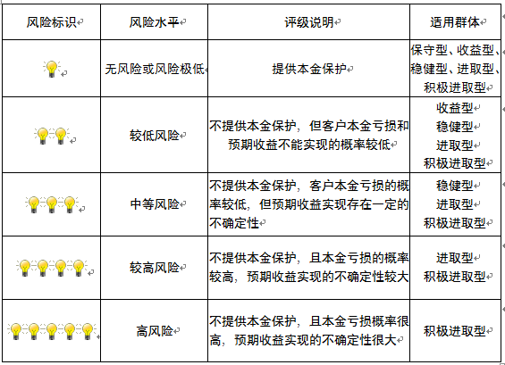 本产品为非保本浮动收益型理财产品,不保证本金和收益,请您充分认识投资风险,谨慎投资。本期产品期限为365天(中国建设银行有权对产品进行展期或提前终止),存续期内,产品不接受申购或赎回申请。本期产品内部风险评级级别为二盏警示灯,风险水平属于较低风险。最不利情况下,您将损失全部收益甚至包括全部本金。本理财产品适用于收益型、稳健型、进取型 、积极进取型客户。