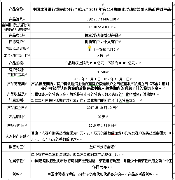 1.本产品规模上限:2.0亿元。在本期产品募集期内,对本期产品的认购金额达到本期理财产品规模上限,则中国建设银行重庆市分行有权利但无义务停止本期产品的认购,已经认购成功的客户投资权益不受影响。