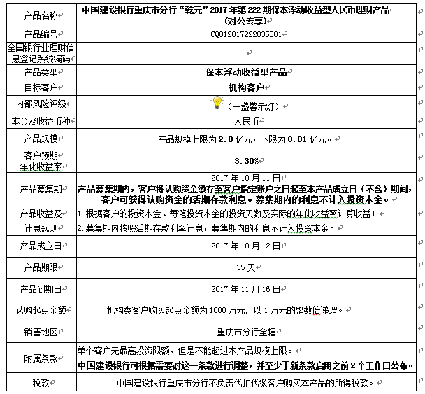 2.本产品规模下限:0.01亿元。在本期产品募集期内,对本期产品的认购金额未能达到本期理财产品规模下限,中国建设银行重庆市分行有权利但无义务宣布本期产品不成立。如产品不成立,中国建设银行将在通知客户产品不成立后1个工作日内返还客户已缴纳的认购本金至客户指定账户,客户应确保账户状态正常,并及时查询账户资金变动情况。