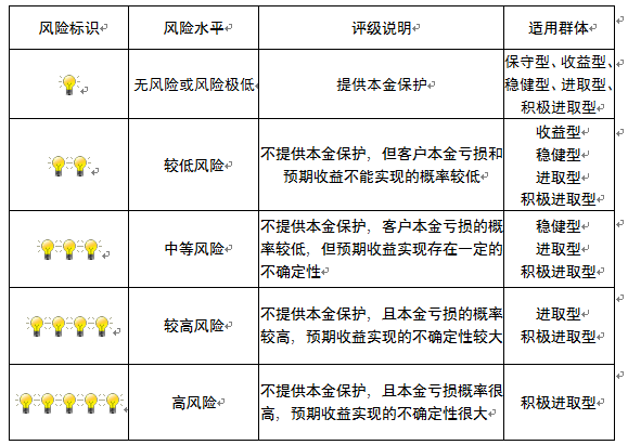 ,风险水平属于较低风险。最不利情况下,您将损失全部收益甚至包括全部本金。本理财产品适用于收益型、稳健型、进取型 、积极进取型客户。