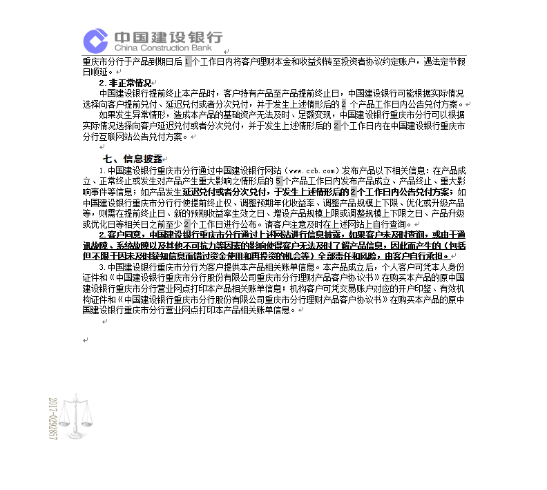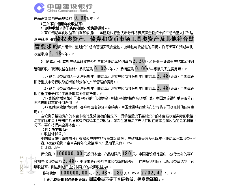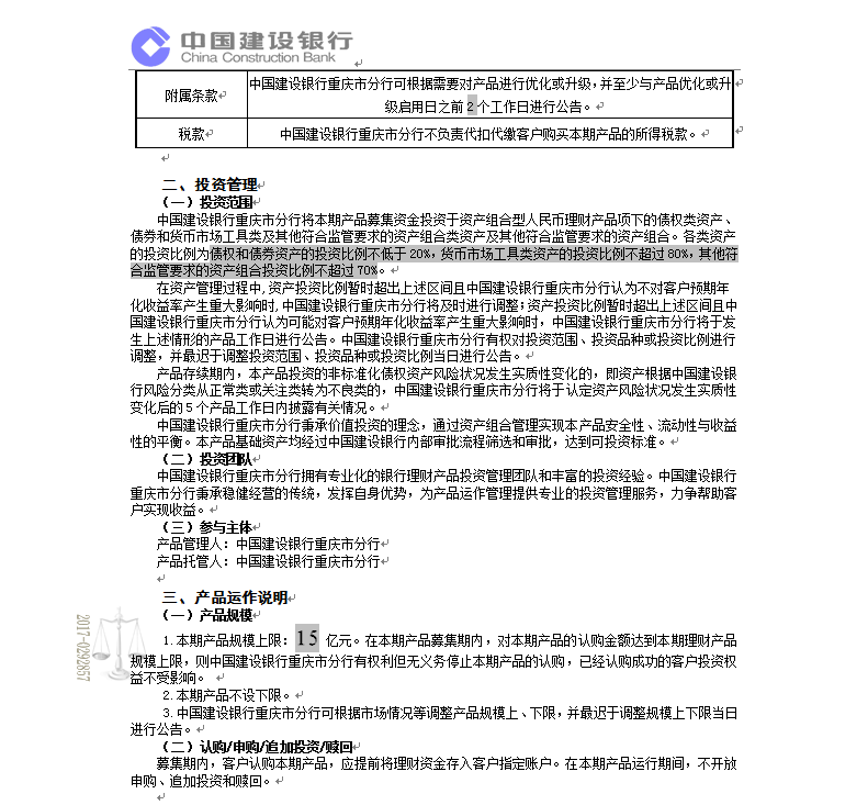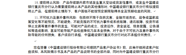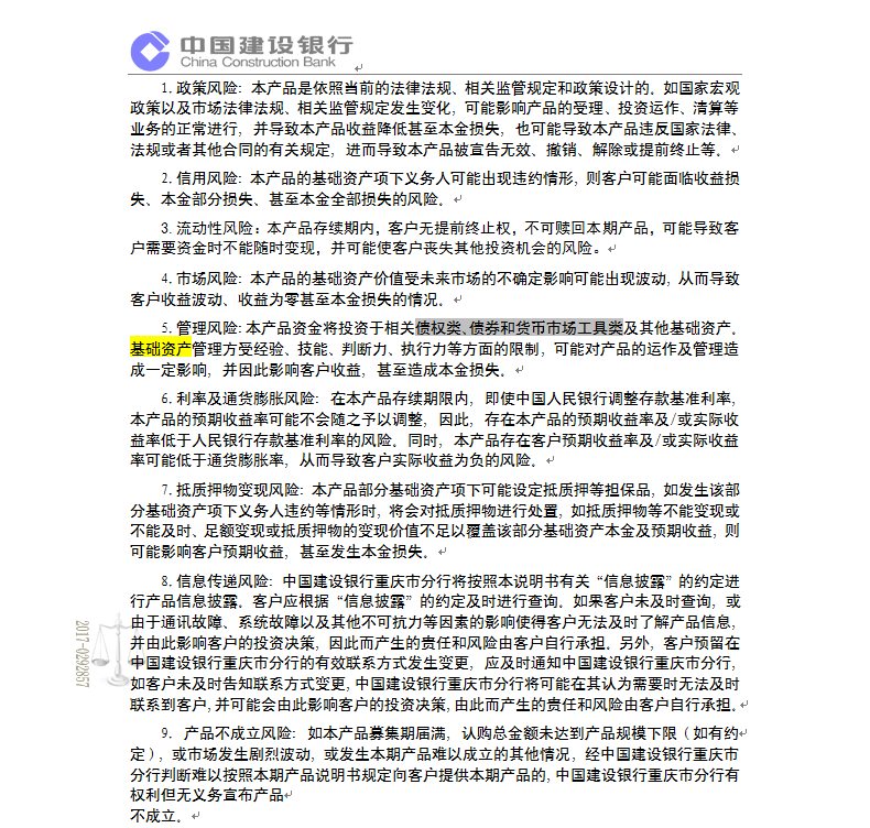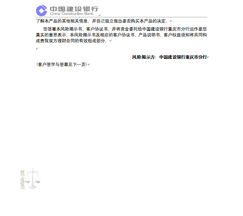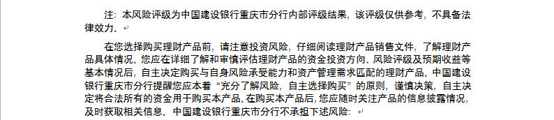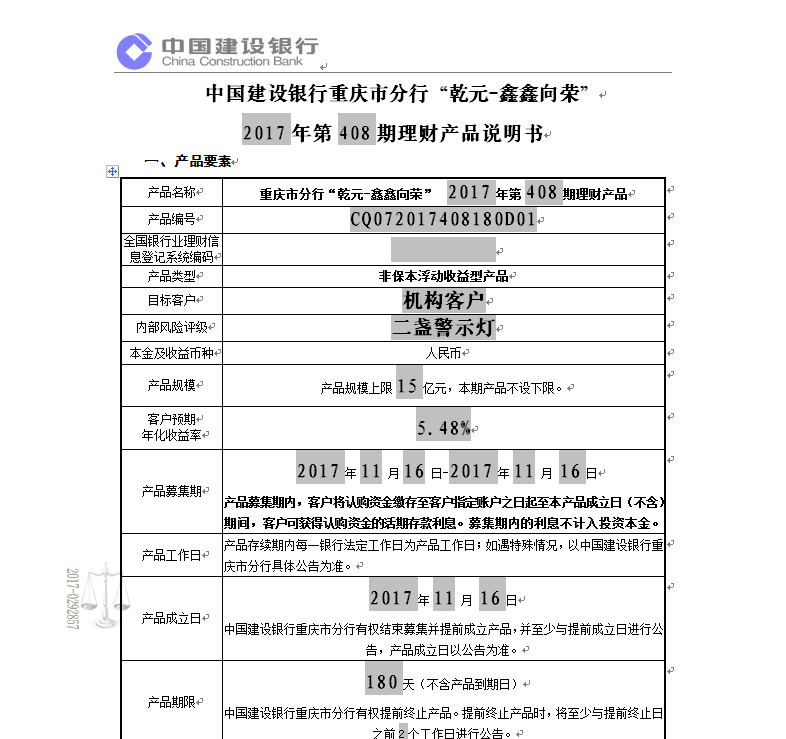 中国建设银行重庆市分行“乾元-鑫鑫向荣” 2017年第408期理财产品说明书和风险揭示书