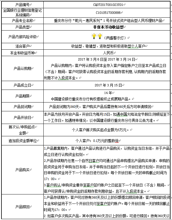 本产品为非保本浮动收益型理财产品,不保证本金和收益,请您充分认识投资风险,谨慎投资。产品期限为14年(中国建设银行重庆市分行有权提前终止或展期产品),产品存续期内任一自然日接受申购/追加投资申请,客户可对持有360天及以上的份额提出赎回申请(超过单个客户累计赎回限额的赎回申请除外,巨额赎回时请以公告为准)。产品内部风险评级级别为二盏警示灯,风险程度属于较低风险。最不利情况下,基础资产无法回收任何本金和收益,客户将损失全部本金。产品适合于收益型、稳健型、进取型、积极进取型客户。