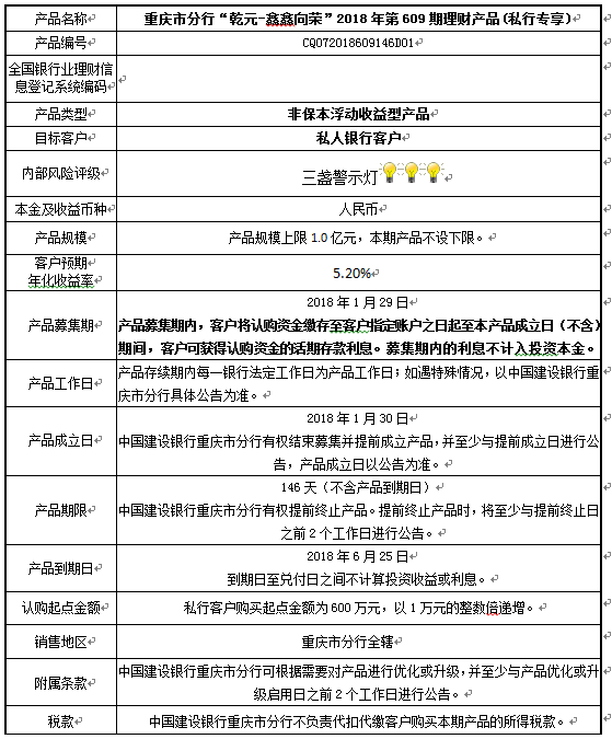 本产品为非保本浮动收益型理财产品,不保证本金和收益,请您充分认识投资风险,谨慎投资。本期产品期限为146天(中国建设银行有权对产品进行展期或提前终止),存续期内,产品不接受申购或赎回申请。本期产品内部风险评级级别为三盏警示灯
