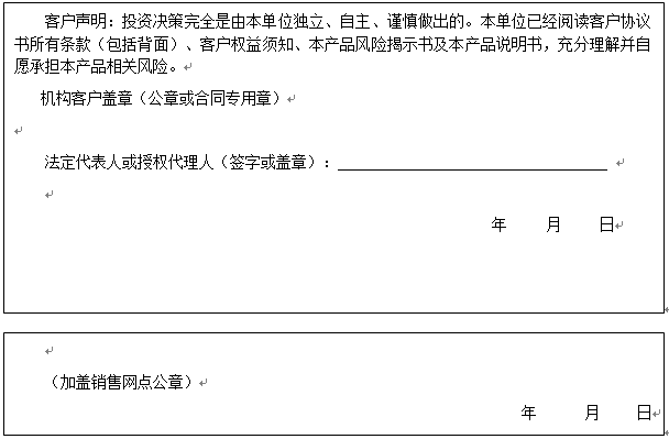 客户签名: ( 客户声明:投资决策完全是由客户独立、自主、谨慎做出的。客户已经阅读客户协议书所有条款(包括背面)、客户权益须知、本产品风险揭示书及本产品说明书,充分理解并自愿承担本产品相关风险。)