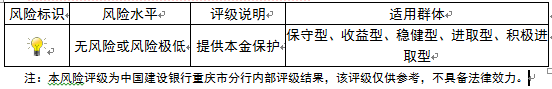 本期产品为保本浮动收益型理财产品,本理财产品有投资风险,只保障理财资金本金,不保证理财收益,您应当充分认识投资风险,谨慎投资。本期产品期限为90天(中国建设银行重庆市分行有权对产品进行展期或提前终止)。本期产品内部风险评级级别为一盏警示灯,风险程度属于无风险或风险极低,适用于保守型、收益型、稳健型、进取型及积极进取型投资者。最不利情况下,客户只能收回投资本金,不能获得任何投资收益。