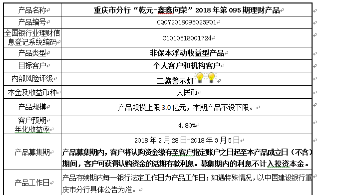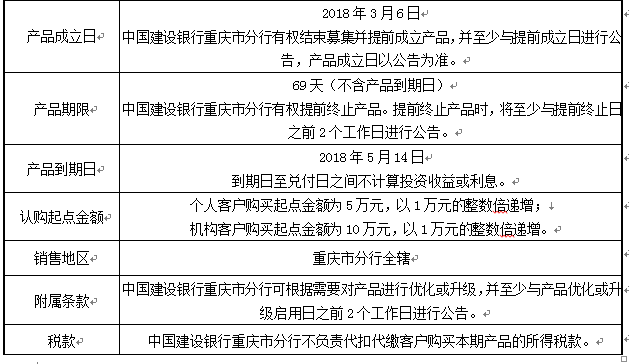 3.中国建设银行重庆市分行可根据市场情况等调整产品规模上、下限,并最迟于调整规模上下限当日进行公告。