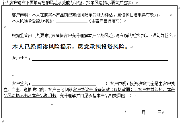 您在签署《中国建设银行股份有限公司理财产品客户协议书》前,应当仔细阅读客户权益须知、本风险揭示书及本产品的产品说明书的全部内容,同时向中国建设银行重庆市分行了解本产品的其他相关信息,并自己独立做出是否购买本产品的决定。
