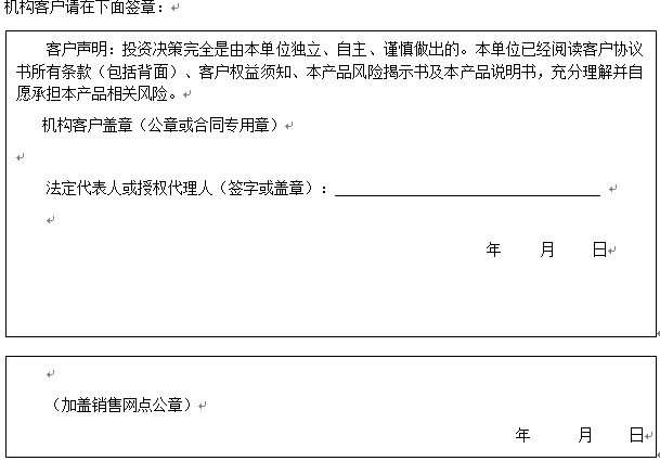 客户签名: ( 客户声明:投资决策完全是由客户独立、自主、谨慎做出的。客户已经阅读客户协议书所有条款(包括背面)、客户权益须知、本产品风险揭示书及本产品说明书,充分理解并自愿承担本产品相关风险。)