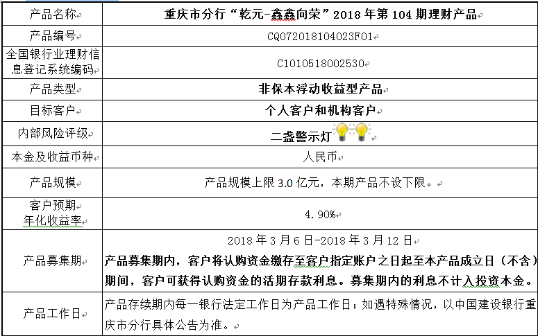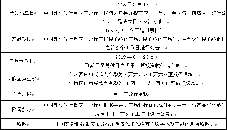 3.中国建设银行重庆市分行可根据市场情况等调整产品规模上、下限,并最迟于调整规模上下限当日进行公告。