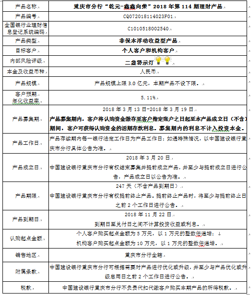 1.本期产品规模上限:3.0亿元。在本期产品募集期内,对本期产品的认购金额达到本期理财产品规模上限,则中国建设银行重庆市分行有权利但无义务停止本期产品的认购,已经认购成功的客户投资权益不受影响。