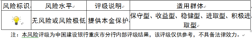 ,风险程度属于无风险或风险极低,适用于保守型、收益型、稳健型、进取型及积极进取型投资者。最不利情况下,客户只能收回投资本金,不能获得任何投资收益。