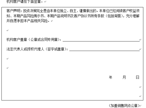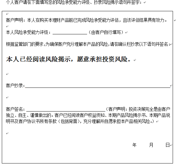 在您签署《中国建设银行股份有限公司理财产品客户协议书》前,应当仔细阅读客户权益须知、本风险揭示书及本产品的产品说明书的全部内容,同时向中国建设银行重庆市分行了解本产品的其他相关信息,并自己独立做出是否认(申)购本产品的决定。