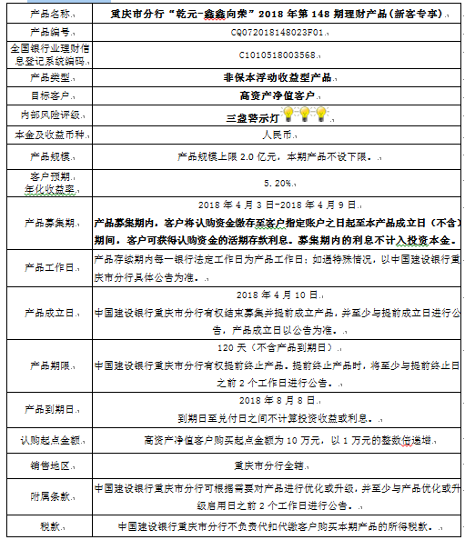 3.中国建设银行重庆市分行可根据市场情况等调整产品规模上、下限,并最迟于调整规模上下限当日进行公告。