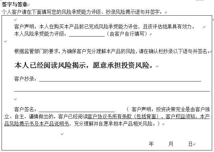 您签署本风险揭示书、客户协议书,并将资金委托给中国建设银行重庆市分行运作是您真实的意思表示。本风险揭示书及相应的客户协议书、产品说明书、客户权益须知将共同构成贵我双方理财合同的有效组成部分。
