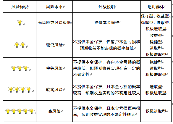 ,风险水平属于较低风险。最不利情况下,您将损失全部收益甚至包括全部本金。本理财产品适用于收益型、稳健型、进取型 、积极进取型客户。