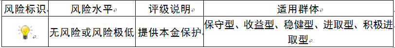 ,风险程度属于无风险或风险极低,适用于保守型、收益型、稳健型、进取型及积极进取型投资者。最不利情况下,客户只能收回投资本金,不能获得任何投资收益。