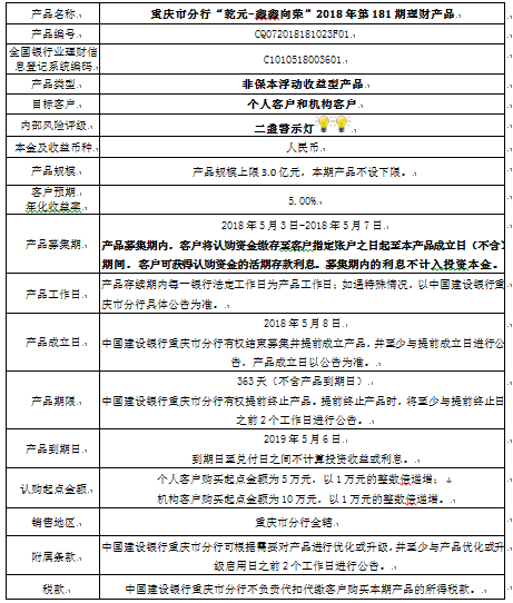 中国建设银行重庆市分行“乾元-鑫鑫向荣” 2018年第181期理财产品风险揭示书和说明书