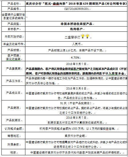 3.中国建设银行重庆市分行可根据市场情况等调整产品规模上、下限,并最迟于调整规模上下限当日进行公告。