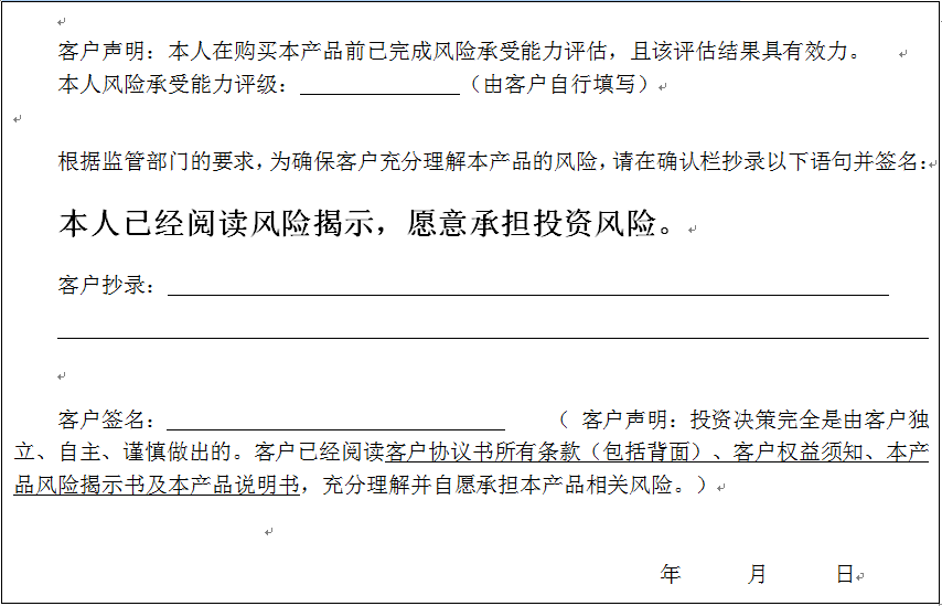 个人客户请在下面填写您的风险承受能力评级、抄录风险揭示语句并签字: