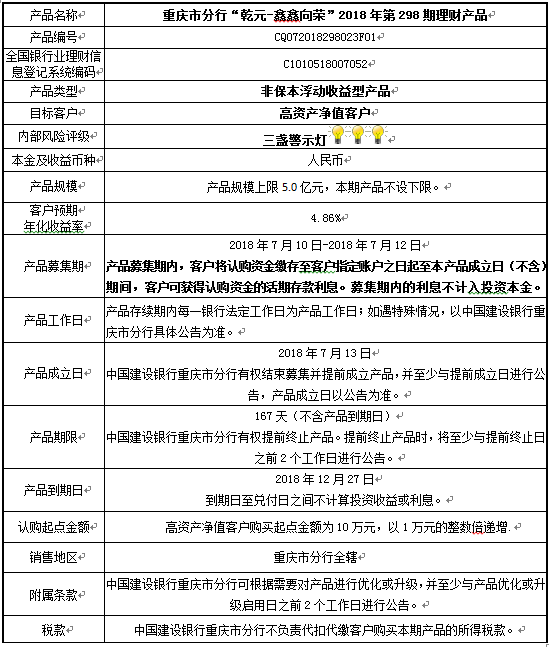 3.中国建设银行重庆市分行可根据市场情况等调整产品规模上、下限,并最迟于调整规模上下限当日进行公告。
