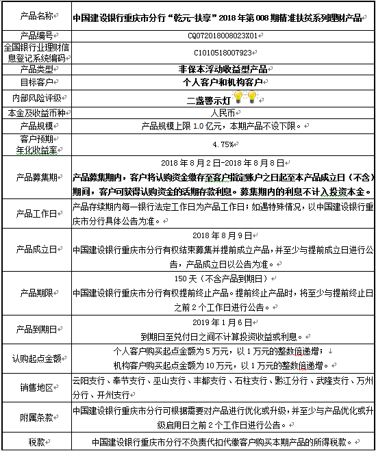 1.本期产品规模上限:1.0亿元。在本期产品募集期内,对本期产品的认购金额达到本期理财产品规模上限,则中国建设银行重庆市分行有权利但无义务停止本期产品的认购,已经认购成功的客户投资权益不受影响。