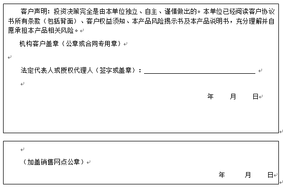 客户签名: ( 客户声明:投资决策完全是由客户独立、自主、谨慎做出的。客户已经阅读客户协议书所有条款(包括背面)、客户权益须知、本产品风险揭示书及本产品说明书,充分理解并自愿承担本产品相关风险。)