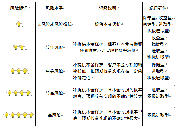 本产品为非保本浮动收益型理财产品,不保证本金和收益,请您充分认识投资风险,谨慎投资。本期产品期限为114天(中国建设银行有权对产品进行展期或提前终止),存续期内,产品不接受申购或赎回申请。本期产品内部风险评级级别为二盏警示灯,风险水平属于较低风险。最不利情况下,您将损失全部收益甚至包括全部本金。本理财产品适用于收益型、稳健型、进取型 、积极进取型客户。