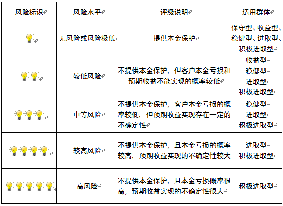 本产品为非保本浮动收益型理财产品,不保证本金和收益,请您充分认识投资风险,谨慎投资。本期产品期限为272天(中国建设银行有权对产品进行展期或提前终止),存续期内,产品不接受申购或赎回申请。本期产品内部风险评级级别为二盏警示灯 ,风险水平属于较低风险。最不利情况下,您将损失全部收益甚至包括全部本金。本理财产品适用于收益型、稳健型、进取型 、积极进取型客户。