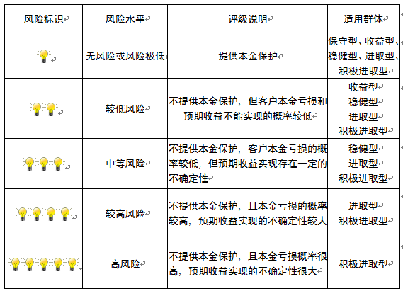 本产品为非保本浮动收益型理财产品,不保证本金和收益,请您充分认识投资风险,谨慎投资。本期产品期限为104天(中国建设银行有权对产品进行展期或提前终止),存续期内,产品不接受申购或赎回申请。本期产品内部风险评级级别为二盏警示灯 ,风险水平属于较低风险。最不利情况下,您将损失全部收益甚至包括全部本金。本理财产品适用于收益型、稳健型、进取型 、积极进取型客户。