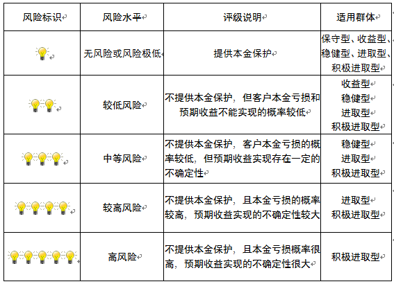 本产品为非保本浮动收益型理财产品,不保证本金和收益,请您充分认识投资风险,谨慎投资。本期产品期限为90天(中国建设银行有权对产品进行展期或提前终止),存续期内,产品不接受申购或赎回申请。本期产品内部风险评级级别为二盏警示灯 ,风险水平属于较低风险。最不利情况下,您将损失全部收益甚至包括全部本金。本理财产品适用于收益型、稳健型、进取型 、积极进取型客户。