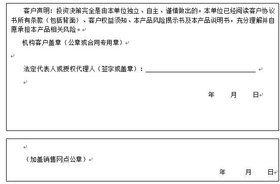 客户签名: ( 客户声明:投资决策完全是由客户独立、自主、谨慎做出的。客户已经阅读客户协议书所有条款(包括背面)、客户权益须知、本产品风险揭示书及本产品说明书,充分理解并自愿承担本产品相关风险。)