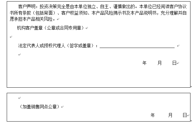 客户签名: ( 客户声明:投资决策完全是由客户独立、自主、谨慎做出的。客户已经阅读客户协议书所有条款(包括背面)、客户权益须知、本产品风险揭示书及本产品说明书,充分理解并自愿承担本产品相关风险。)