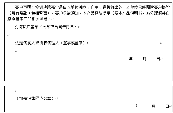 客户签名: ( 客户声明:投资决策完全是由客户独立、自主、谨慎做出的。客户已经阅读客户协议书所有条款(包括背面)、客户权益须知、本产品风险揭示书及本产品说明书,充分理解并自愿承担本产品相关风险。)