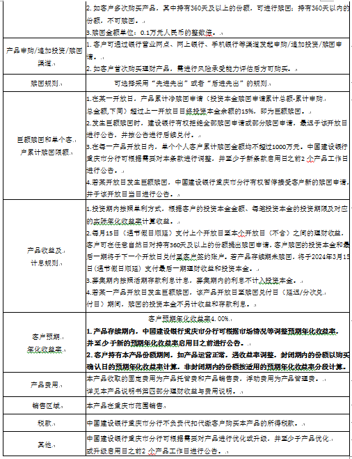 4.中国建设银行重庆市分行可根据市场情况等调整预期年化收益率,并至少于新的预期年化收益率启用日前进行公告。