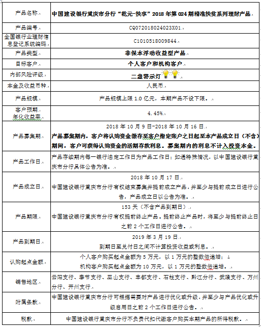 3.中国建设银行重庆市分行可根据市场情况等调整产品规模上、下限,并最迟于调整规模上下限当日进行公告。