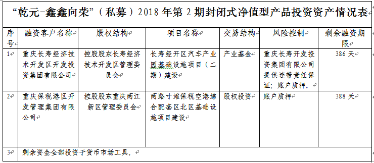 “乾元-鑫鑫向荣”(私募)2018年第2期封闭式净值型产品投资资产情况表