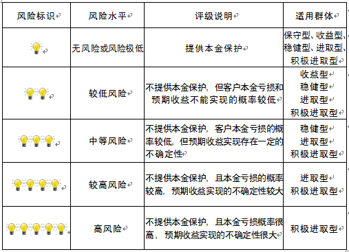 本产品为非保本浮动收益型理财产品,不保证本金和收益,请您充分认识投资风险,谨慎投资。本期产品期限为92天(中国建设银行有权对产品进行展期或提前终止),存续期内,产品不接受申购或赎回申请。本期产品内部风险评级级别为三盏警示灯 ,风险水平属于中等风险。最不利情况下,您将损失全部收益甚至包括全部本金。本理财产品适用于稳健型、进取型 、积极进取型客户。